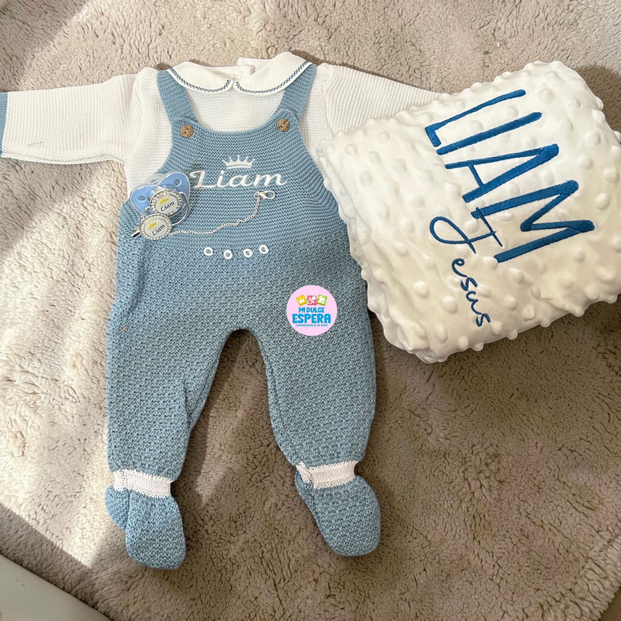 3. Manta personalizada con nombre: lado frontal de tejido polar con burbujas en relieve y reverso de microfibra sherpa. Tamaño: 70 × 90 cm, ideal para la delicada piel del bebé.