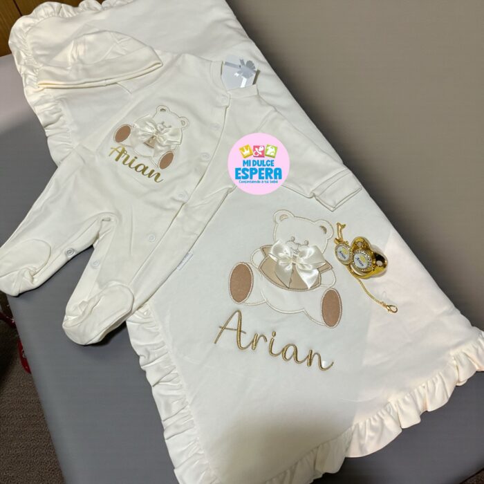 1. conjunto Largo 100% hipoalergénico incluye mameluco y gorro
